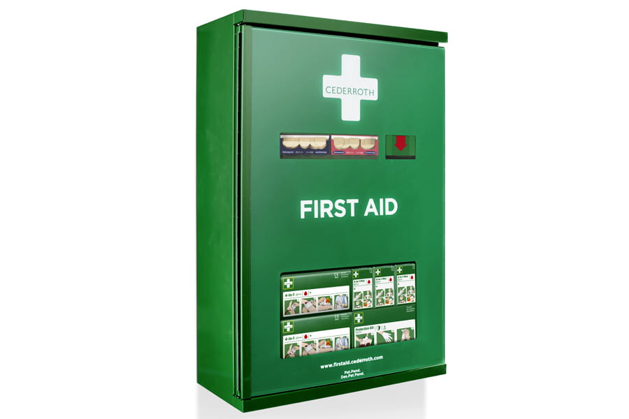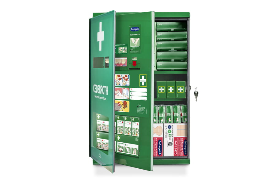 Cederroth First Aid Cabinet REF 290900 to przemysłowa, ścienna apteczka pierwszej pomocy w metalowej obudowie, zaprojektowana z myślą o wymagających warunkach: zapyleniu, wilgoci, zabrudzeniach. Apteczka składa się z dwóch części — zewnętrznej, łatwo dostępnej, służącej do szybkiej interwencji, oraz wewnętrznej zamykanej części na zapasy uzupełniające. Dzięki solidnej konstrukcji i dobrze dobranemu wyposażeniu produkt nadaje się do dużych zakładów przemysłowych, magazynów, warsztatów, a także miejsc, gdzie wymagane jest szerokie spektrum środków pierwszej pomocy.