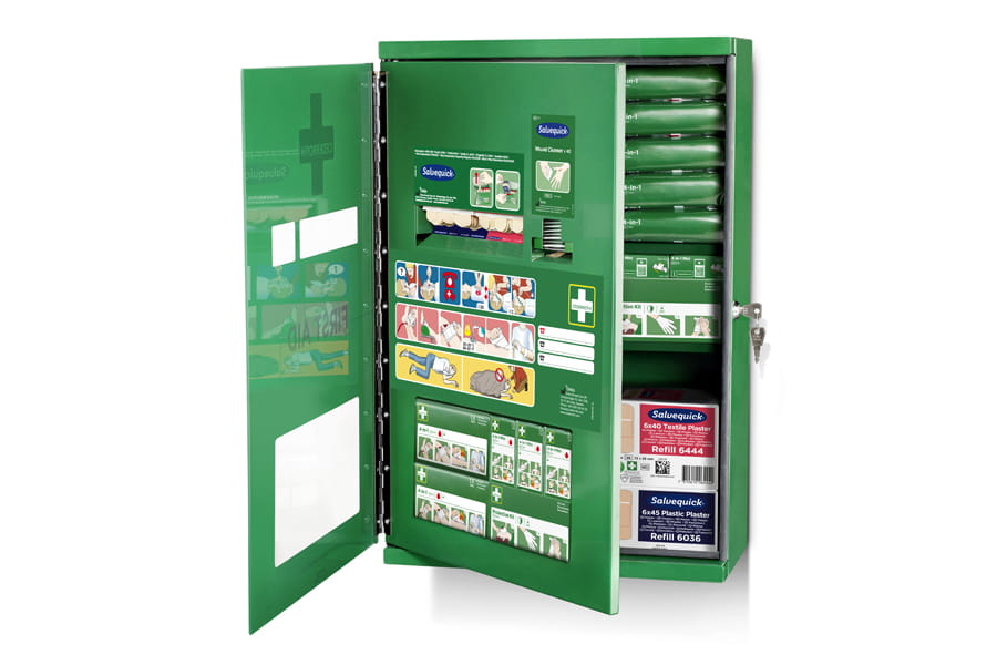 Solidna metalowa konstrukcja — większa trwałość niż zwykłe apteczki plastikowe lub materiałowe.