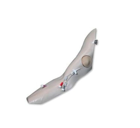 Ramię Port Access Arm to kluczowy komponent symulatora: zawiera podwójny (duale) cewnik PICC o średnicy 5 Fr wychodzący z żyły basilicznej w wewnętrznej części bicepsa oraz wstępnie zamontowany cewnik dożylny 20G na przedramieniu. W pobliżu miejsca wkłucia PICC znajduje się zagłębienie przeznaczone na opcjonalny obwodowy port (IVAD), który jednak nie jest dołączony do zestawu — jego podstawa wykonana jest z materiału miękkiego, co pozwala portowi „unosić się” (float) w trakcie palpacji i wkłucia, zapewniając realistyczne odczucia.