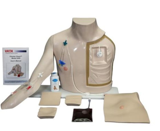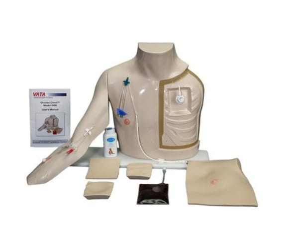 Model VATA Chester Chest z standardowym ramieniem, jasna skóra to kompleksowy simulator torsu dorosłego człowieka zaprojektowany w celu szkolenia personelu medycznego i ratowniczego w zakresie opieki nad żylnymi dostępami centralnymi oraz technik wkłuć i pielęgnacji. Torso ma realistyczne odwzorowanie anatomiczne klatki piersiowej, szyi i barku, umożliwia pracę w pozycji stojącej lub leżącej.