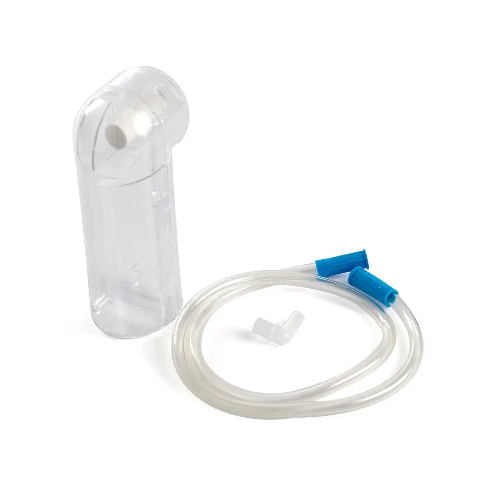 Pojemnik montuje się łatwo dzięki zatrzaskom, co umożliwia szybką wymianę pojemnika w praktyce klinicznej. Zawiera filtr wewnętrzny, który działa jako bariera zabezpieczająca pompę ssaka przed przeniknięciem cieczy — filtr automatycznie przerywa ssanie, gdy pojemnik zostaje napełniony lub w przypadku przewrócenia urządzenia.