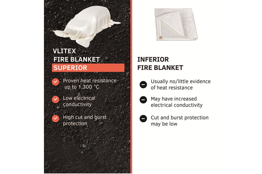 Koc gaśniczy SUPERIOR 6 x 8m VLITEX do gaszenia samochodów, SUV li-on – 200151 + torba to zaawansowane techniczne narzędzie zaprojektowane do szybkiego i efektywnego gaszenia większych pożarów, szczególnie tych związanych z pojazdami wyposażonymi w akumulatory litowo-jonowe, takimi jak samochody osobowe i SUV-y. Produkt umożliwia przykrycie źródła ognia w celu odcięcia dopływu tlenu, ograniczenia intensywności płomieni, obniżenia temperatury oraz redukcji emisji dymu i toksycznych gazów. Koc cechuje wysoka odporność na temperatury sięgające w krótkim czasie do 1300 °C i długotrwale do 1150 °C, co pozwala na skuteczną izolację ognia nawet w trudnych warunkach. Konstrukcja została wykonana z wysokiej jakości tkaniny Silica Vermiculit z obszywanymi krawędziami oraz wyposażona w cztery długie uchwyty w narożnikach dla szybkiego i bezpiecznego nakładania. Produkt jest przeznaczony do jednorazowego użycia w sytuacjach awaryjnych, po wykorzystaniu wymaga utylizacji. Torba transportowa dołączona w zestawie ułatwia przechowywanie i zapewnia szybki dostęp do koła w razie potrzeby.