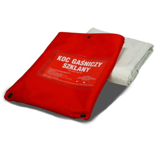 Koc gaśniczy wykonany z wytrzymałego materiału z włókna szklanego, do zamocowania na ścianie.