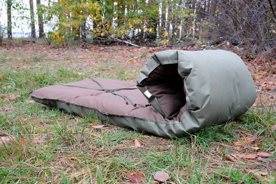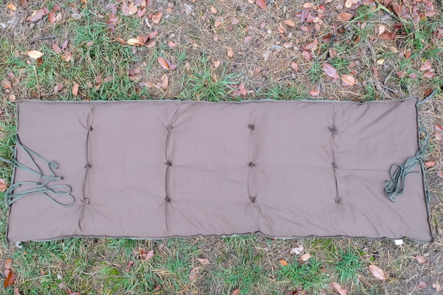 Warstwa wierzchnia została wykonana z bawełny dostępnej w odcieniach zieleni, brązu lub szarości, a warstwa dolna z gumowanej tkaniny, co zapewnia zwiększoną odporność na wilgoć oraz możliwość użytkowania bezpośrednio na podłożu. Wypełnienie stanowi naturalny ocieplacz zwany watoliną, który zapewnia komfort i izolację termiczną. Materac wyróżnia się lekką konstrukcją i wygodą użytkowania. Stan produktu: nowy, wyprodukowany w Polsce.