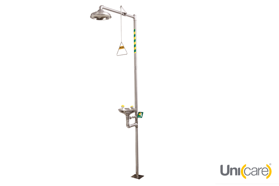 Prysznic bezpieczeństwa z oczomyjką Unicare USES 7 CSS304 stanowi niezbędne wyposażenie miejsc pracy, gdzie istnieje ryzyko kontaktu z substancjami chemicznymi. Te awaryjne urządzenie umożliwia szybkie płukanie oczu i ciała po wystąpieniu potencjalnie niebezpiecznej sytuacji, minimalizując obrażenia i zmniejszając ryzyko powikłań, w tym utraty wzroku. Model USES 7 CSS304 to prysznic stojący, montowany do podłogi i ściany, wyposażony w niezależnie działającą myjkę do oczu z misą. Aktywacja prysznica następuje poprzez pociągnięcie za wyznaczone cięgło, a strumień wody pozostaje otwarty do momentu ręcznego zamknięcia tego samego cięgła. Myjka do oczu aktywowana jest za pomocą płytki naciskowej. Miska receptorowa zastosowana w tym produkcie jest odporna na uszkodzenia spowodowane roztworami soli, kwasami, olejami i zasadami, dzięki czemu jest trwała i zapewnia długą żywotność. Jest testowany zgodnie z najnowszymi normami krajowymi i międzynarodowymi, zapewniając w ten sposób odpowiednie bezpieczeństwo podczas użytkowania w miejscu pracy.