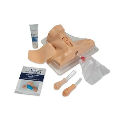 Zawartość zestawu: symulator z podstawą, 6 wymiennych powłok szyi (neck skins), 6 wkładek tchawic osób dorosłych (4 sztywne, 2 miękkie), 6 wkładek tchawic dziecięcych (4 sztywne, 2 miękkie), symulowane płuco, instrukcja obsługi, walizka transportowa
