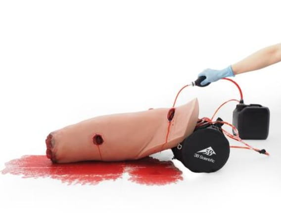 Trenażer jest zaprojektowany tak, aby mógł być używany w warunkach polowych — jest stabilny, nie wymaga zewnętrznego zasilania ani baterii, a jego konstrukcja pozwala na łatwe czyszczenie i transport. Zawartość zestawu obejmuje model kończyny z przeznaczonymi ranami, pokrywy ran umożliwiające modyfikację scenariusza, system pompki i zbiornik na sztuczną krew oraz worek transportowy i dodatkowe akcesoria.