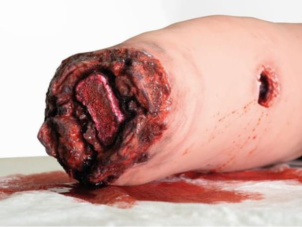Skóra modelu wykonana jest z wysokiej jakości silikonu SKINlike™, który odwzorowuje dotyk i odczucie tkanek ludzkich, zawiera również widoczne elementy kostne oraz wyczuwalne naczynie uszkodzonej żyły/ tętnicy. Dzięki systemowi pompki ręcznej model umożliwia symulację zarówno krwotoku żylnego, jak i tętniczego z pulsującym przepływem, a po prawidłowym założeniu opaski uciskowej krwawienie zostaje mechanicznie przerwane — co stanowi bezpośrednią informację zwrotną dla ćwiczącego.