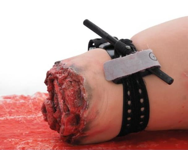 zakładanie opaski uciskowej „wysoko i ciasno” (high and tight) lub 5–8 cm nad raną, zarówno jako jednej opaski, jak i podwójnej.
