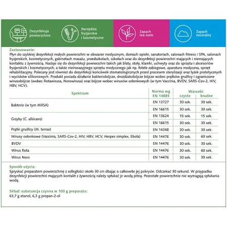 - 30 sekund na bakterie, prątki gruźlicy i wirusy (w tym Rota i Noro).