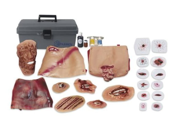 Zestaw makiet obejmuje szeroki zakres urazów, co pozwala na realistyczne scenariusze: oparzenia, złamania, rany postrzałowe, uszkodzenia tkanek miękkich.
