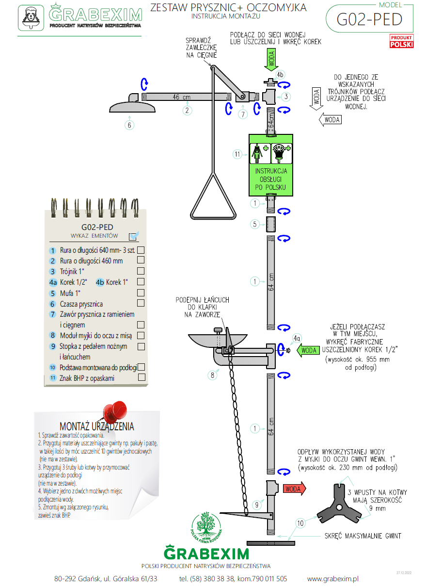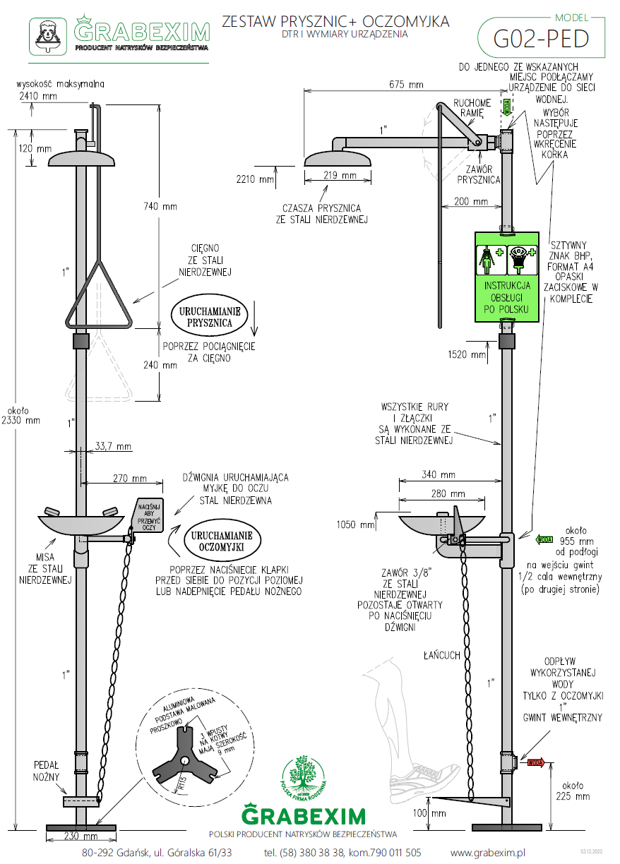 Zestaw prysznic i oczomyjka G02‑PED to stacjonarna stacja bezpieczeństwa zaprojektowana do czyszczenia ciała oraz oczu w sytuacjach awaryjnych. Urządzenie składa się z prysznica bezpieczeństwa oraz myjki do oczu, które mogą działać niezależnie od siebie — może to być kluczowe w sytuacjach, kiedy zachodzi potrzeba natychmiastowego przepłukania zarówno całego ciała, jak i oczu.